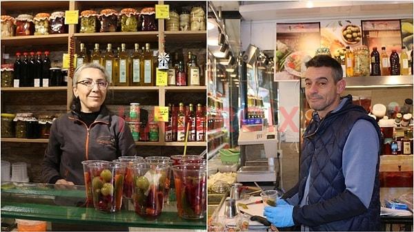 Karşılıklı turşucu işleten çift, görenlere Sevinçli Günler sinemasını hatırlattı.