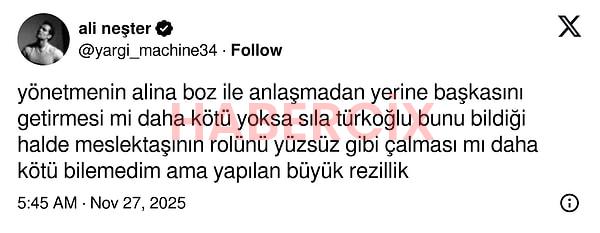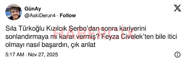 Diziye dair heyecan artarken Kızılcık Şerbeti’nden ayrılan Sıla Türkoğlu hakkında iddialar yayıldı. Doc dizisinin yönetmeninin Alina Boz yerine Sıla Türkoğlu’nu istediği söylenmişti. Sıla Türkoğlu’nun diziyle anlaşıp anlaşmadığı netleşmedi ancak Alina Boz’un kadrodan çıkarıldığını beklemediği bir anda öğrenmiş olması torpil iddialarına neden oldu. Şimdiyse X kullanıcıları hem sektörü hem de Sıla Türkoğlu’nu eleştiriyor.
