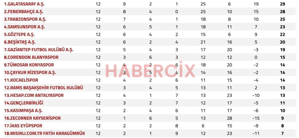 İşte 12. haftanın ardından Süper Lig’de oluşan puan durumu…