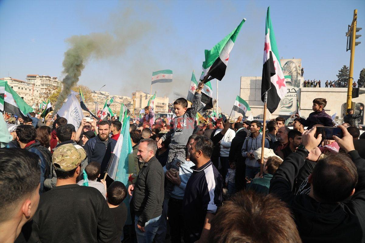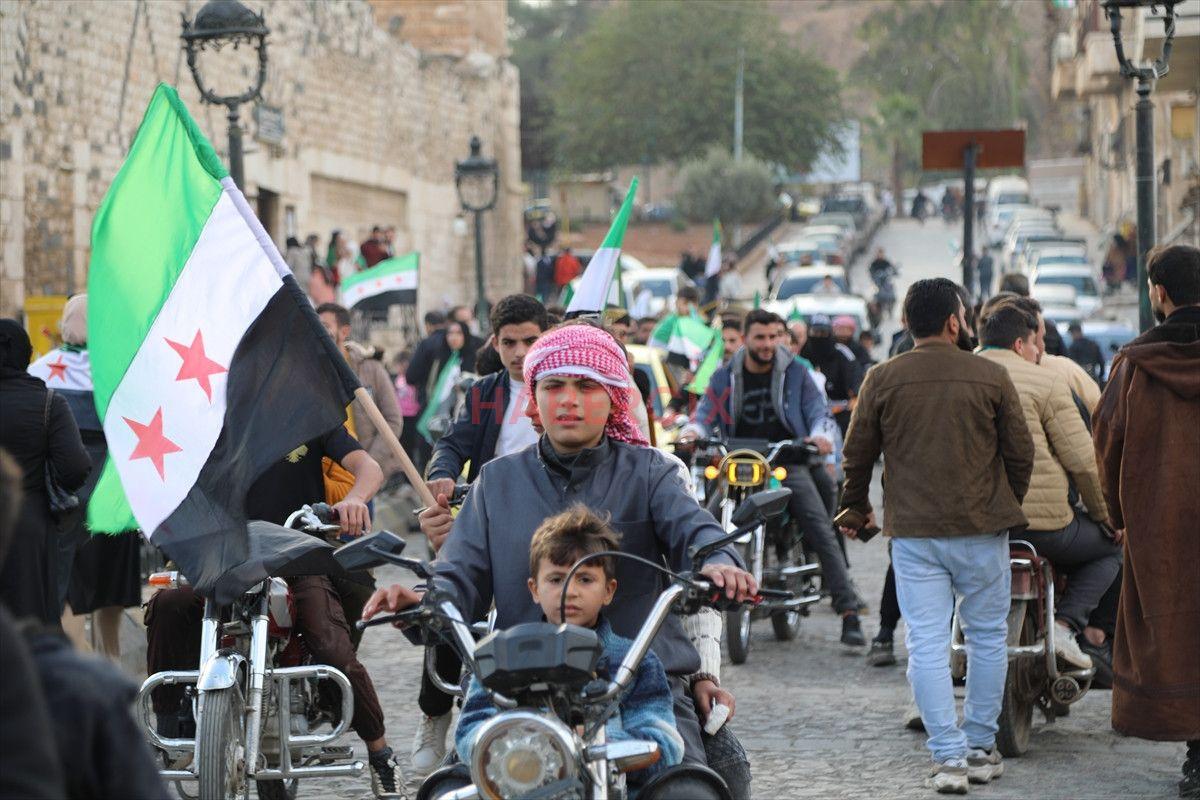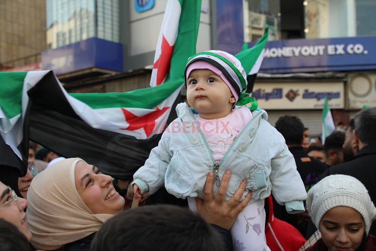 “Özgür Suriye” sloganı atan binlerce kişi, Suriye devrimi ile özdeşleşen çeşitli şarkılar söyleyerek Baas rejiminin devrilmesini kutladı.