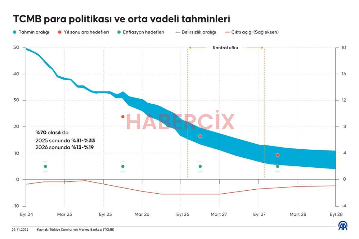 Geçen hafta Enflasyon Raporu’nun tanıtımı maksadıyla düzenlenen bilgilendirme toplantısında konuşan Fatih Karahan, “2025 yıl sonunda enflasyonun yüzde 31 ile yüzde 33 aralığında olacağını iddia ediyoruz. 2026 sonu için ise iddialarımız enflasyonun yüzde 13 ile yüzde 19 aralığına gerileyeceğine işaret ediyor.” dedi.