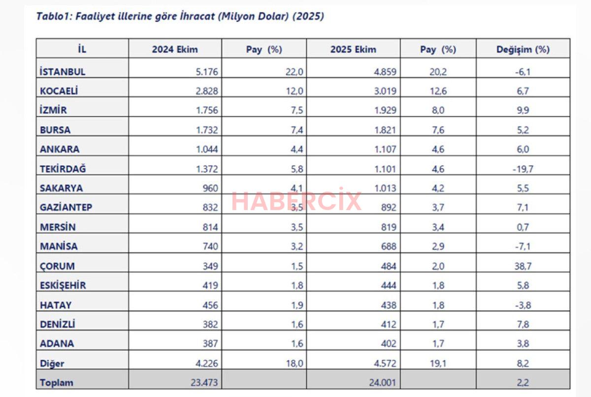 2025 YILI EKİM AYINDA FAALİYET VİLAYETLERİ BAZINDA İHRACATTA;