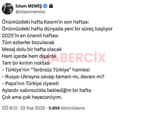 Mesaj dolu bir hafta olacağını ileri süren Memiş, X hesabından yaptığı paylaşımda ‘Tüm ezberler bozulacak. Mesaj dolu bir hafta olacak. Hem içerde hem dışarda. Tam bir kırılım noktası. Türkiye’nin ‘Terörsüz Türkiye’ hamlesi. Rusya-Ukrayna savaşı tamam mı, devam mı? Papa’nın Türkiye ziyareti…