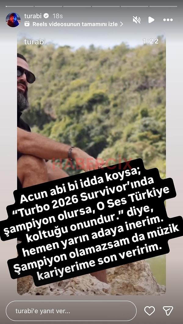 ‘Turbo 2026 Survivor’ında şampiyon olursa, O Ses Türkiye koltuğu onundur.’ diye, hemen yarın adaya inerim. Şampiyon olamazsam da müzik kariyerime son veririm.”