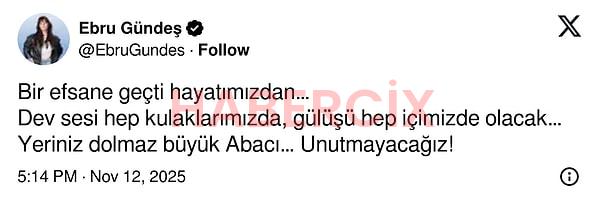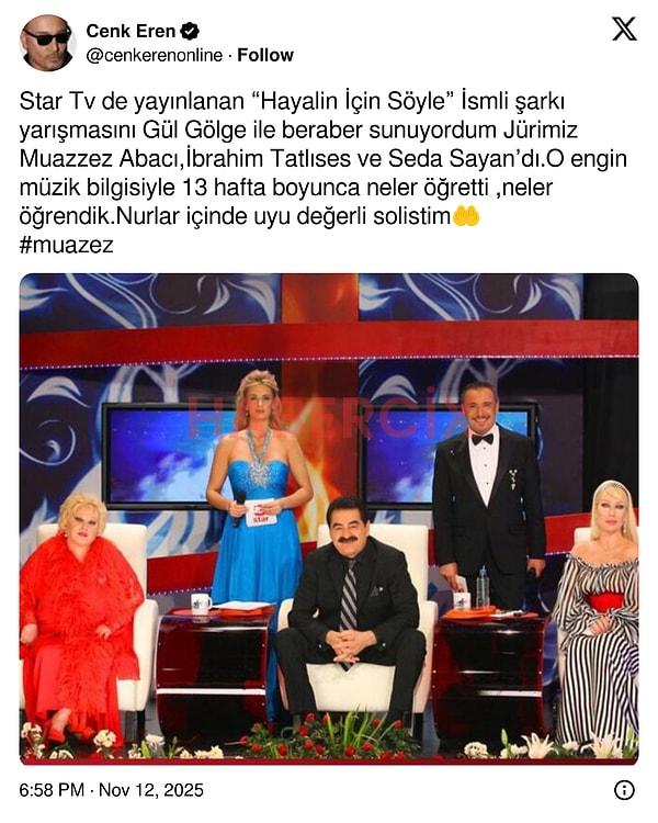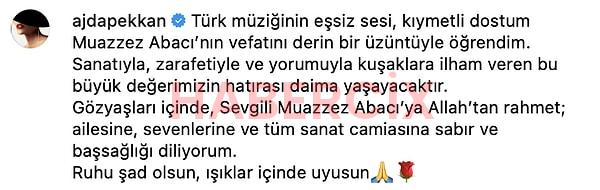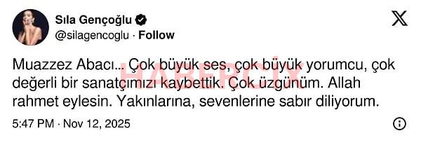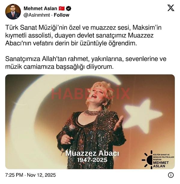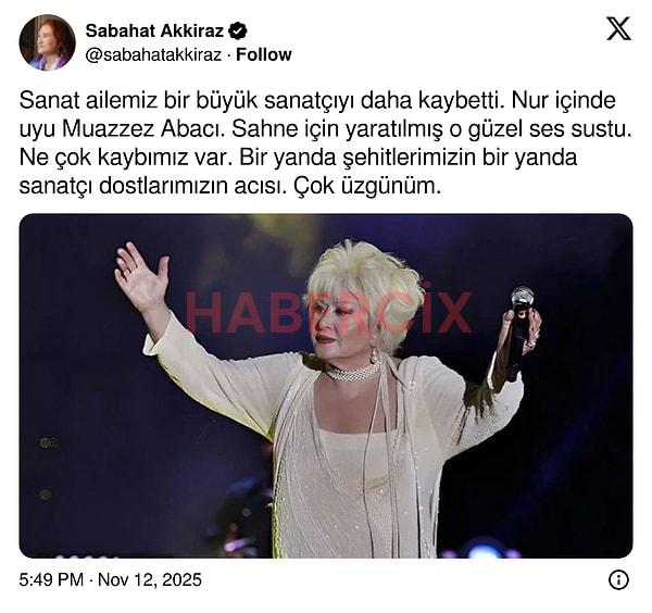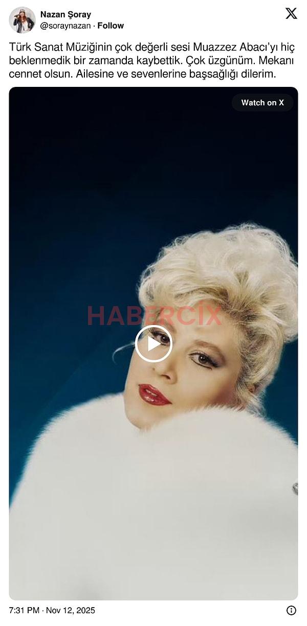 12 Kasım’da doğum gününde hayatını kaybeden usta sanatçı Muazzez Abacı’nın mevti sanat topluluğunu yasa boğdu. Ünlü isimlerden Muazzez Abacı’ya son veda bildirileri peş peşe geldi.