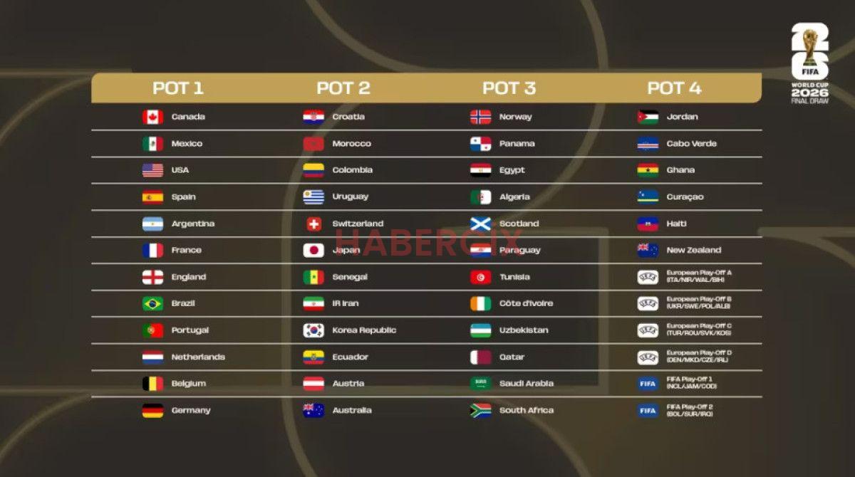 Ev sahibi Kanada, Meksika ve ABD’nin 1. torbaya koyulduğu ve kalan 39 ülkenin, 19 Kasım Çarşamba günü yayınlanan ülke puanına göre her biri 12 takımdan oluşan dört torbaya yerleştirildiği aktarıldı.