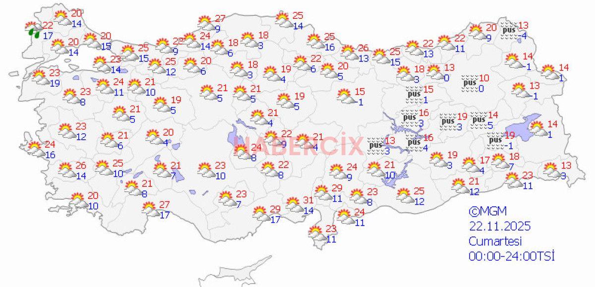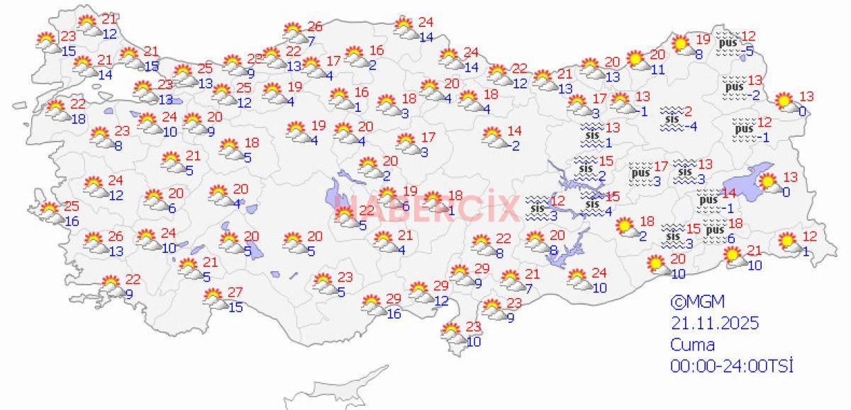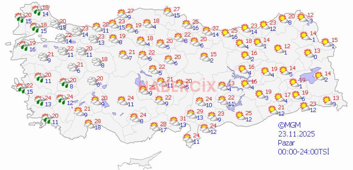 Sıcaklık, Marmara’da 21-26, Ege’de 24-29, Akdeniz’de 26-31, İç Anadolu’da 21-27, Karadeniz’de 22-28, Doğu Anadolu’da 19-25, Güneydoğu Anadolu’da 24-30 derece olacak.