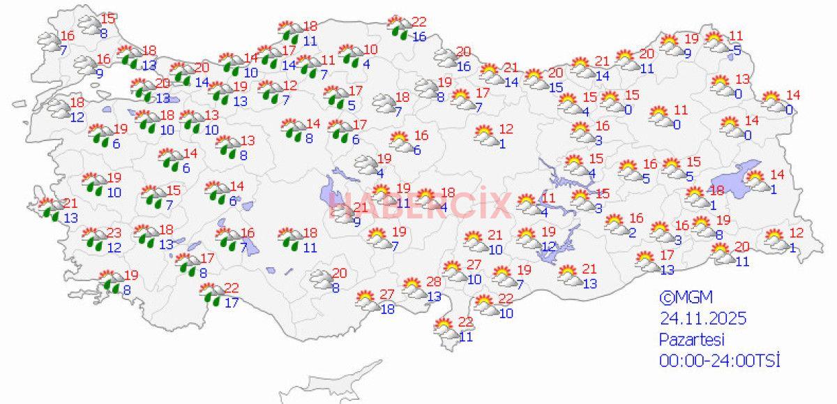 Pazartesi günü ise ülkeyi genel olarak az bulutlu ve güneşli bir gün bekliyor.
