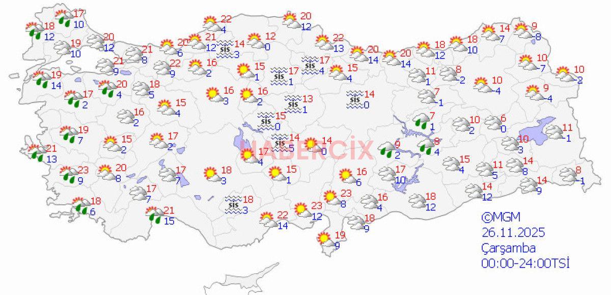 26 Kasım Çarşamba günü ülke genelinde kesimli bulutlu bir hava bekleniyor.