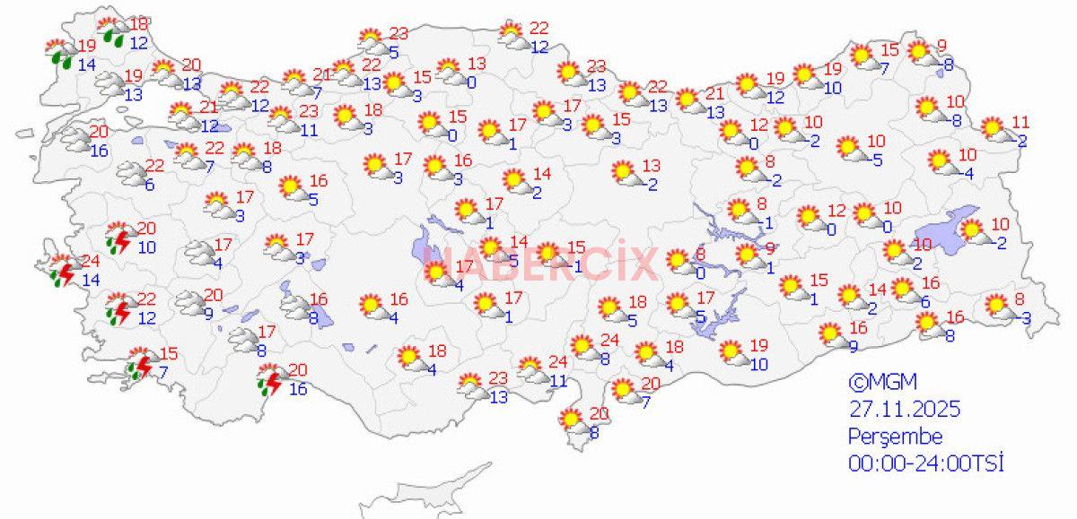 27 Kasım Perşembe günü Marmara ve Ege’de kesimli bulutlu, iç ve doğu bölgelerde kar yağışlı hava sürecek.