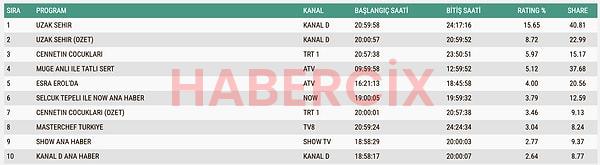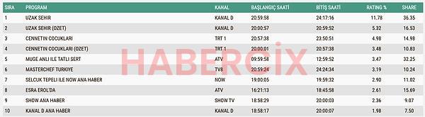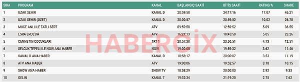 11.78 reyting alan Uzak Şehir, AB grubunun da zirvesinde yer aldı. Cennetin Çocukları ve özeti 3 ve 4. sırada yer alırken, Müge Anlı ile Tatlı Sert 5. sıraya geriledi.