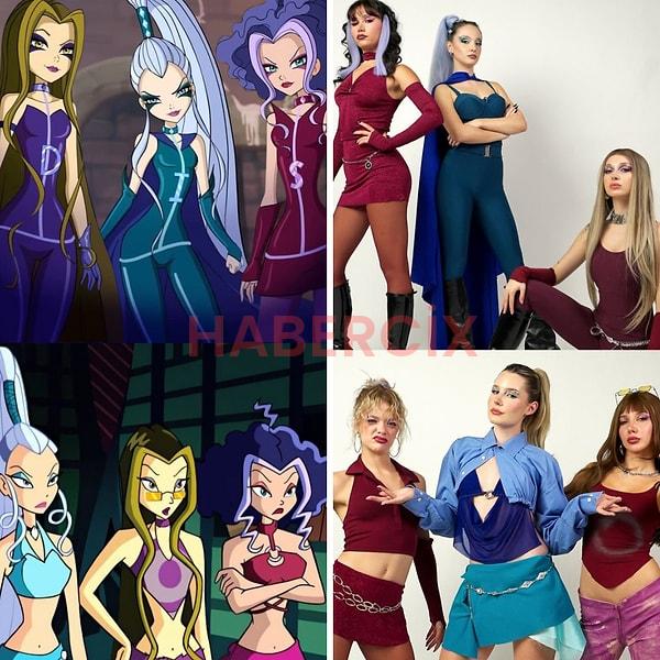 Winx Club serisinin baş düşmanları olan üç cadı; Icy, Darcy ve Stormy kostümleri giyen kızlar, bu sefer tarzlarıyla sınıfta kaldı.
