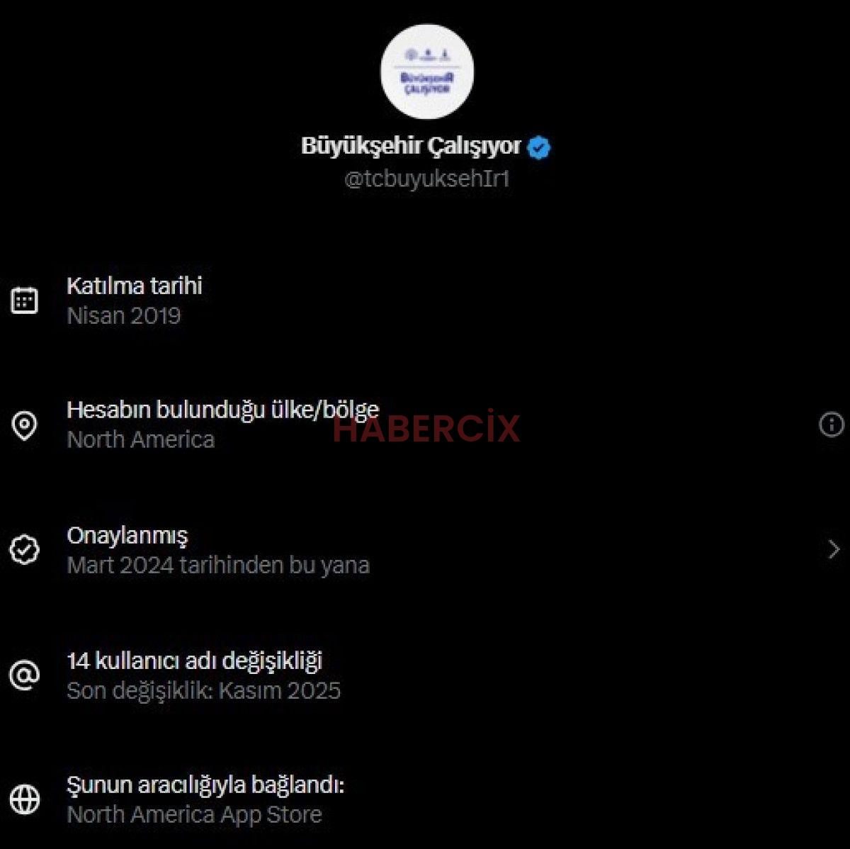 “Büyükşehir Çalışıyor” adlı hesabın konumu yine Kuzey Amerika olarak görünüyor.