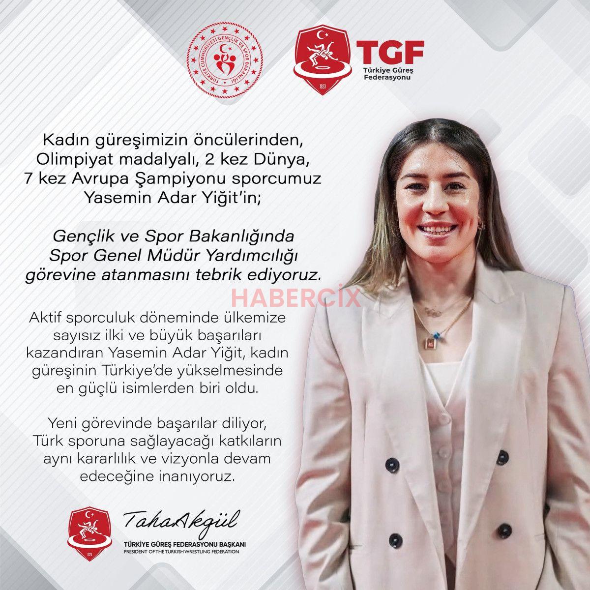 Türkiye Güreş Federasyonu’ndan yapılan açıklamada “Kadın güreşimizin öncülerinden, olimpiyat madalyalı, 2 kez dünya, 7 kez Avrupa şampiyonu sporcumuz Yasemin Adar Yiğit’in, Gençlik ve Spor Bakanlığında Spor Genel Müdür Yardımcılığı görevine atanmasını tebrik ediyoruz.” denildi.