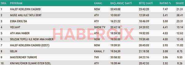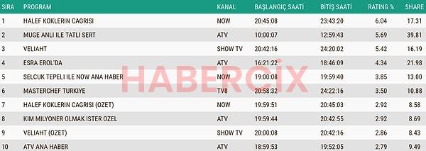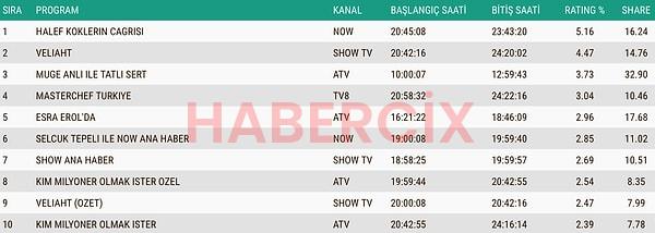 Dizilerin yanı sıra gündüz kuşağı programları göze çarptı. Müge Anlı ile Tatlı Sert, Total ve ABC1’de ikinci sıraya yerleşti. Esra Erol da Total sıralamasında üçüncüydü.